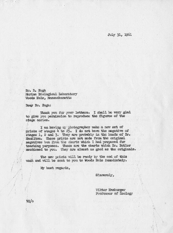 Viktor Hamburger to Roberts Rugh, July 31, 1961