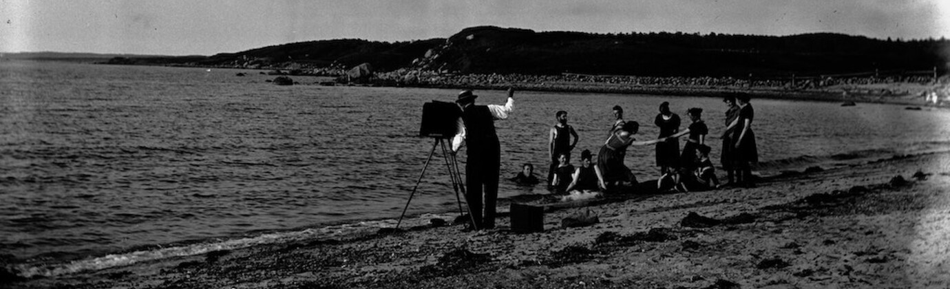 Photographer with straw hat and tripod black hooded camera. Bathers in period bathing suits