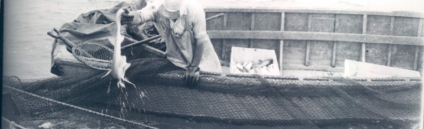 Black and white photo of Swede Carlson pulling a small shark out of the water